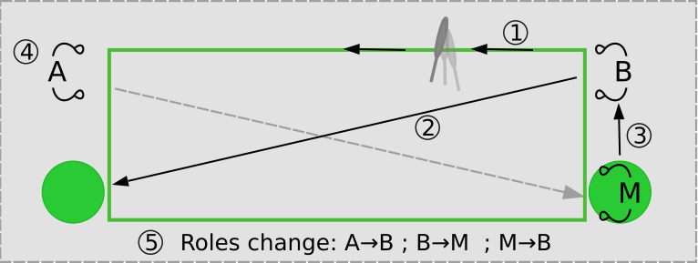 Here, M has already walked to the other side (grey dotted arrow line) and is ready to take the place of B (black arrow). B will become M at this point and walk to the green circle on the other side (long black arrow). |