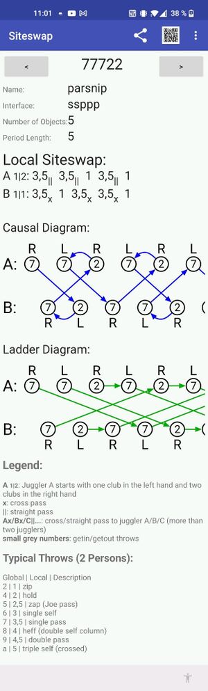 • Ladder Diagram//Siteswap Diagram: The diagram shows the way of each object, each arrow points to the beat given by the siteswap number later. If a 7 is thrown, the arrow points to the hand that throws 7 beats later